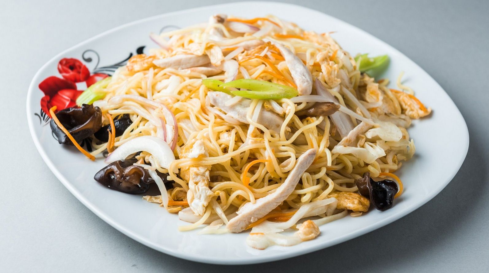 Με κοτόπουλο, αυγό, λάχανο, κρεμμύδι, καρότο, σόγια σως, και μανιτάρια