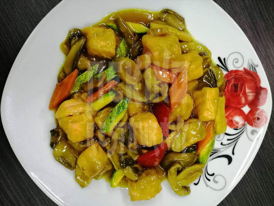 Πολύ καυτερό. Με μπαμπού, αγγούρι, sauce Κονγκ-Πάο, κρεμμύδι, καρότο και κάσιους